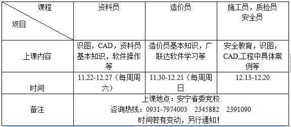 單位集中培訓(xùn),蘭州交通大學(xué)師資,中共省委黨校上課,提高優(yōu)惠研究生公寓住宿費(fèi)用自理。如有需要培訓(xùn)的單位或個(gè)人請電話咨詢報(bào)名:黨校:0931-7974003,建院:0931-2931090,西站:0931-2345882,網(wǎng)上咨詢報(bào)名:百度【中豐建科】進(jìn)入工程考試培訓(xùn)中心或登錄:m.ztiw.cn 或關(guān)注中豐建科公眾賬號:中豐建科。