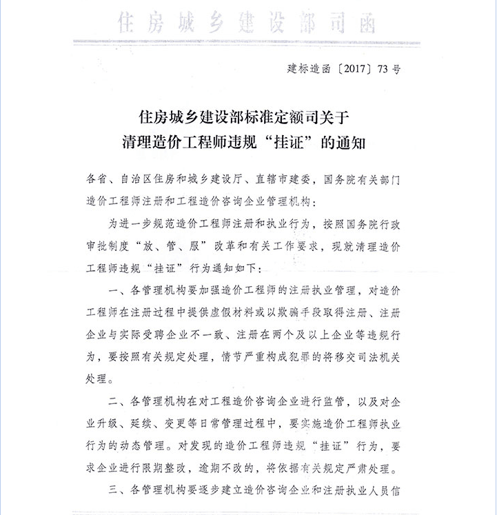 住房城鄉建設部標準定額司關于清理造價工程師違規“掛證”的通知