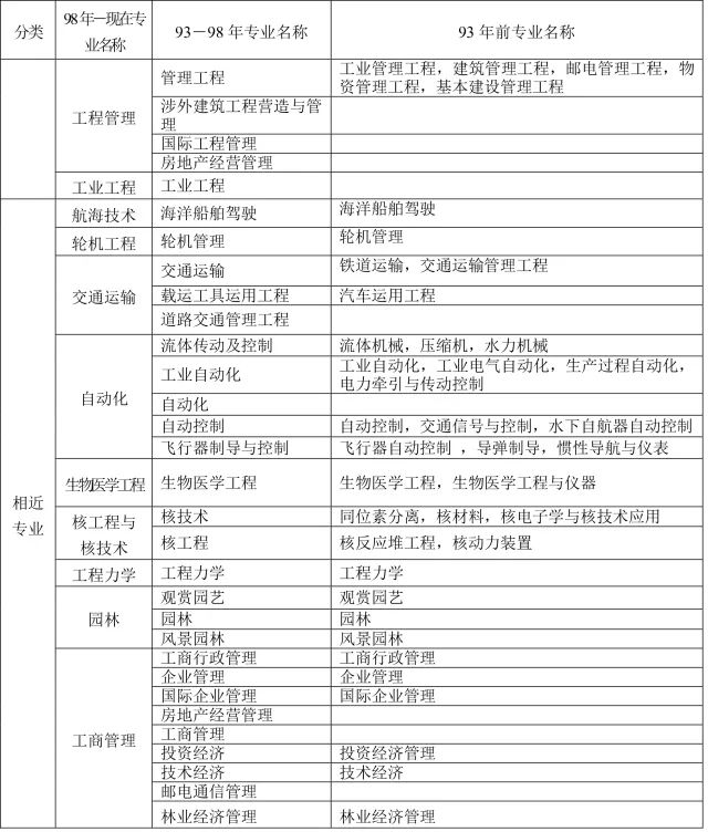 3、 為便于考核認(rèn)定條件中有關(guān)專(zhuān)業(yè)學(xué)歷的確認(rèn),對(duì)“本專(zhuān)業(yè)”、“相近專(zhuān)業(yè)”和“其他專(zhuān)業(yè)”進(jìn)行了劃分,供申報(bào)和審核考核認(rèn)定條件時(shí)參考。其他專(zhuān)業(yè)的具體范圍由建設(shè)部、人事部確認(rèn)。