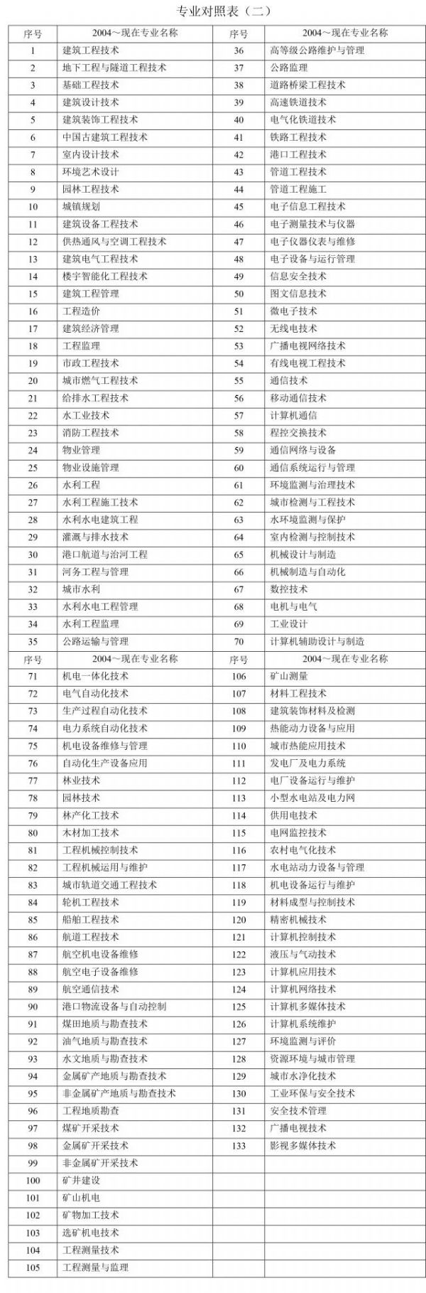 注:本表按教育部現(xiàn)行《普通高等學(xué)校高職高專(zhuān)教育指導(dǎo)性專(zhuān)業(yè)目錄(2005年版)》編制。共涉及“土建施工類(lèi)、工程管理類(lèi)、建筑設(shè)計(jì)類(lèi)、城鎮(zhèn)規(guī)劃與管理類(lèi)、建筑設(shè)備類(lèi)、市政工程類(lèi)、房地產(chǎn)類(lèi)、水利工程與管理類(lèi)、機(jī)械設(shè)計(jì)制造類(lèi)、自動(dòng)化類(lèi)、電子信息類(lèi)、通訊類(lèi)、環(huán)保類(lèi)、機(jī)電設(shè)備類(lèi)、公路運(yùn)輸類(lèi)、鐵路運(yùn)輸類(lèi)、港口運(yùn)輸類(lèi)、管道運(yùn)輸類(lèi)、林業(yè)技術(shù)類(lèi)、城市軌道運(yùn)輸類(lèi)、水上運(yùn)輸類(lèi)、民用運(yùn)輸類(lèi)、資源勘查類(lèi)、水利水電設(shè)備類(lèi)、地質(zhì)工程與技術(shù)類(lèi)、礦冶工程類(lèi)、礦物加工類(lèi)、測(cè)繪類(lèi)、材料類(lèi)、能源類(lèi)、電力技術(shù)、計(jì)算機(jī)類(lèi)、安全類(lèi)、廣播影視類(lèi)”等34類(lèi)133個(gè)專(zhuān)業(yè),其中本專(zhuān)業(yè)76個(gè),相近專(zhuān)業(yè)57個(gè)。