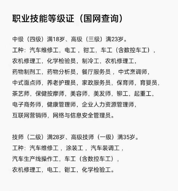 依據(jù)國家職業(yè)標準,社會培訓評價職業(yè)技能等級分五級,分別為初級工(五級)、中級工(四級)、高級工(三級)、技師(二級)、高級技師(一級)。其中,高級職稱相當于高級技師(一級)職業(yè)技能等級證,中級職稱相當于技師(二級)職業(yè)技能等級證,初級職稱相當于高級工(三級)職業(yè)技能等級證