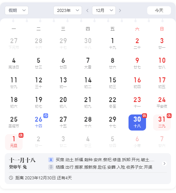 2023年12月30日(星期六)至2024年1月1日(星期一)放假調休,共3天。2024年1月2日(星期二)上班。提前預祝各位心想事成,工作順利。元旦快樂!